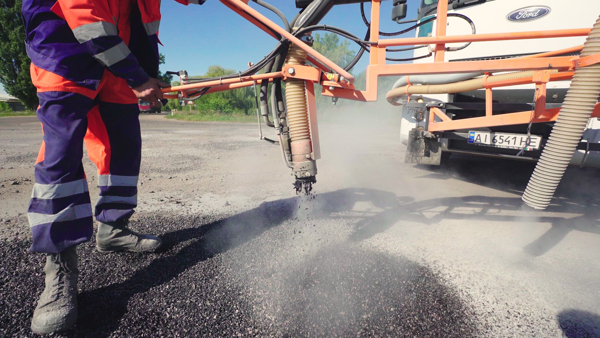 Йдеться про ліквідацію вибоїн машиною Savalco SR 1501 з використанням бітумної емульсії.