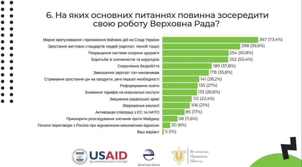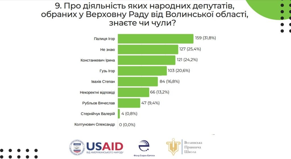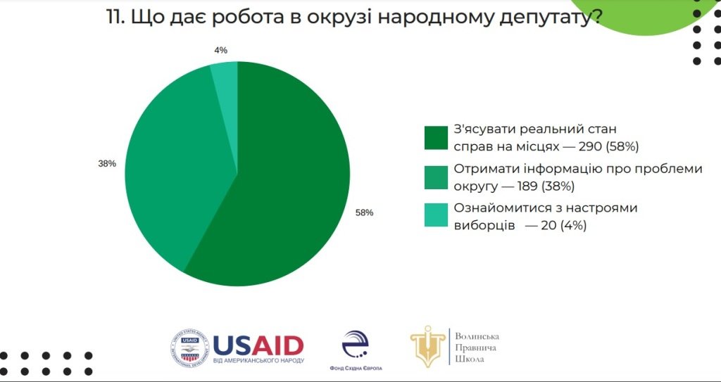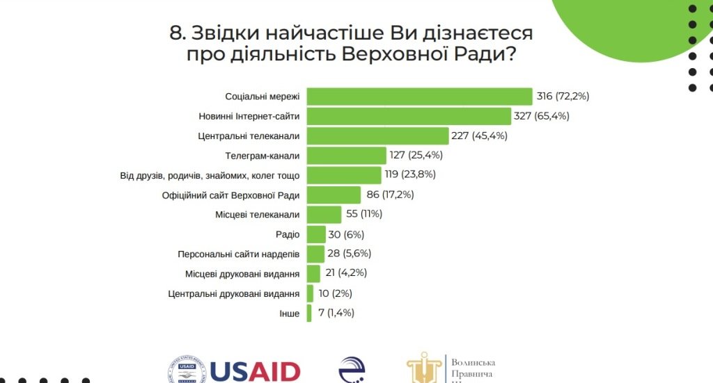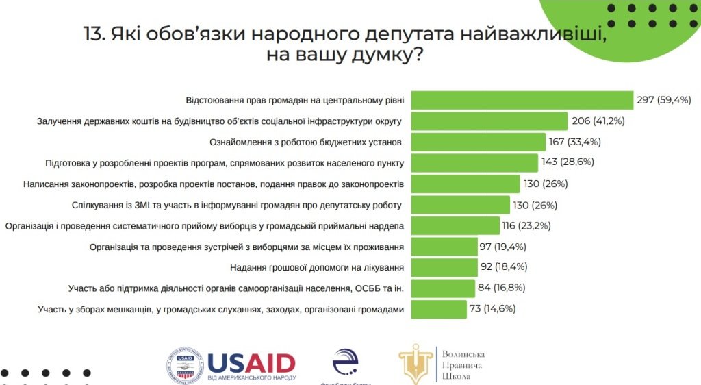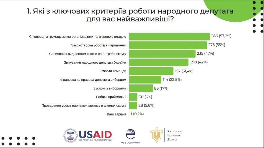 Понад 73% молоді вважає, що одним з основних питань, на яких має зосередити роботу Верховна Рада, є мирне врегулювання конфлікту та припинення бойових дій на сході України, на другому та третьому місцях – зростання життєвих стандартів людей (майже 60%) та покращення системи охорони здоров’я (понад 50%).39% опитаних відповіли, що не довіряють інформації про роботу Верховної Ради, оскільки часто вона не відповідає дійсності. Понад 72% респондентів дізнаються про діяльність ВР із соціальних мереж. На другому місці – новинні сайти, на третьому – центральні телеканали. Дедалі популярнішими в цьому полі стають Telegram-канали.Щодо ключових критеріїв роботи народного депутата, то найважливішою було названо співпрацю з громадськими організаціями та місцевою владою (понад 57%). Водночас молодь вважає однією з ключових у роботі депутатів законотворчу діяльність, а також сприяння у виділенні коштів на округи, які вони представляють.Обираючи народного депутата, молодь звертає найбільше уваги на чесність, непричетність до корупції, високий професіоналізм і досвід попередньої діяльності кандидата. Найбільше молоді люди обізнані з діяльністю народного депутата Ігоря Палиці (майже 32%), на другому місці – Ірина Констанкевич (понад 24%), на третьому – Ігор Гузь (майже 21%).86% опитаних вважають, що у Верховній Раді народний депутат має розв’язувати питання свого округу і лобіювати його інтереси та відстоювати на всіх рівнях влади. 58% опитаних переконані, що присутність депутата в окрузі та співпраця з громадами дають можливість з’ясувати реальний стан справ на місцях і отримати правдиву інформацію про те, що відбувається в районах і маленьких населених пунктах.Народна депутатка Ірина Констанкевич подякувала усім, хто долучився до реалізації проєкту, зокрема Програмі USAID «РАДА: відповідальність, підзвітність, демократичне парламентське представництво» та Фонду Східна Європа.