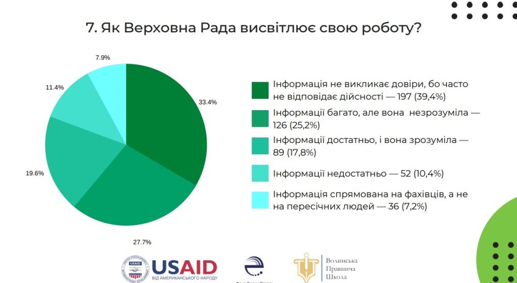 Отож, в опитуванні взяло участь 500 респондентів – жителів Волинської області віком 18-35 років, 81% із них – жінки, 19% – чоловіки.Опитування складалося із двох блоків запитань: про діяльність Верховної Ради України та про діяльність народного депутата України. За його результатами з’ясувалося, що молодь не дуже схильна довіряти Верховній Раді як колегіальному органу (38%), а от щодо діяльності народних депутатів ситуація набагато краща. 52,4% опитаних вважають, що нинішня Верховна Рада намагається покращити ситуацію в країні, хоча є певні труднощі, які не призводять до очікуваних результатів.45% респондентів вважають, що монобільшість у парламенті має і позитивні, і негативні наслідки. Щодо діяльності фракцій, то найбільше молодь цікавить діяльність фракції «Слуга народу», а якщо говорити про депутатські групи, то більший інтерес спостерігається до діяльності депутатської групи «За майбутнє».