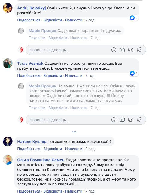 «Ми із сусідами були на виконкомі, бо в черговий раз, обходячи всі наші вимоги і побажання, мерія запланувала видати дозвіл на будівництво ще одного житлового комплексу в нашому районі. Щоби ви собі уявляли: наш район – це трикутник між вулицями Підголоско, Варшавська та Малоголосківська. Це 160 га території. Відповідно до генплану, тут заплановано збудувати дороги, дитячі садочки та дві школи. Реально – немає нічого. Тільки кожного року з’являються нові незаконні висотки. У нас немає інфраструктури, немає доріг, зелені насадження повністю знищено, немає водостоків, каналізація не витримує, бо розрахована на одноповерхові приватні будиночки, під час злив усе підтоплює, а потім стаються зсуви грунту. Що робить мерія? Замість рятувати ситуацію, незаконно врізає нові висотки по 200-300 квартир на ділянці, де має стояти один маленький одноповерховий будиночок. То як нам тут жити? Ми судилися кілька разів. Вигравали суди. А потім Садовий присилав своїх юристів і ми знову все програвали», – розповідає львів’янка.