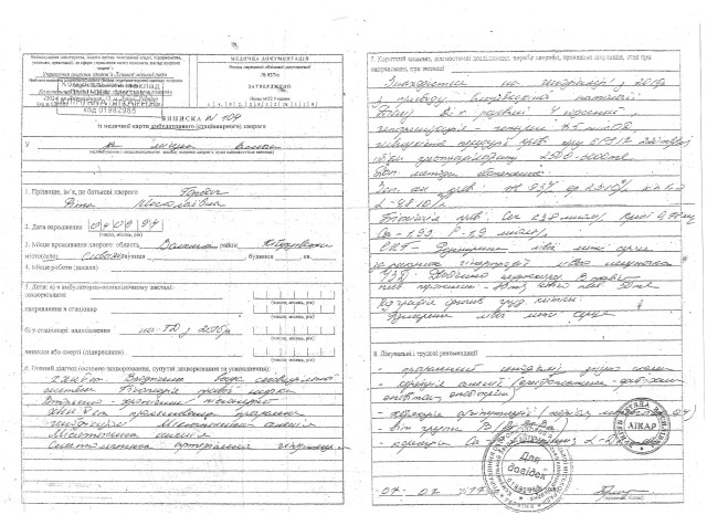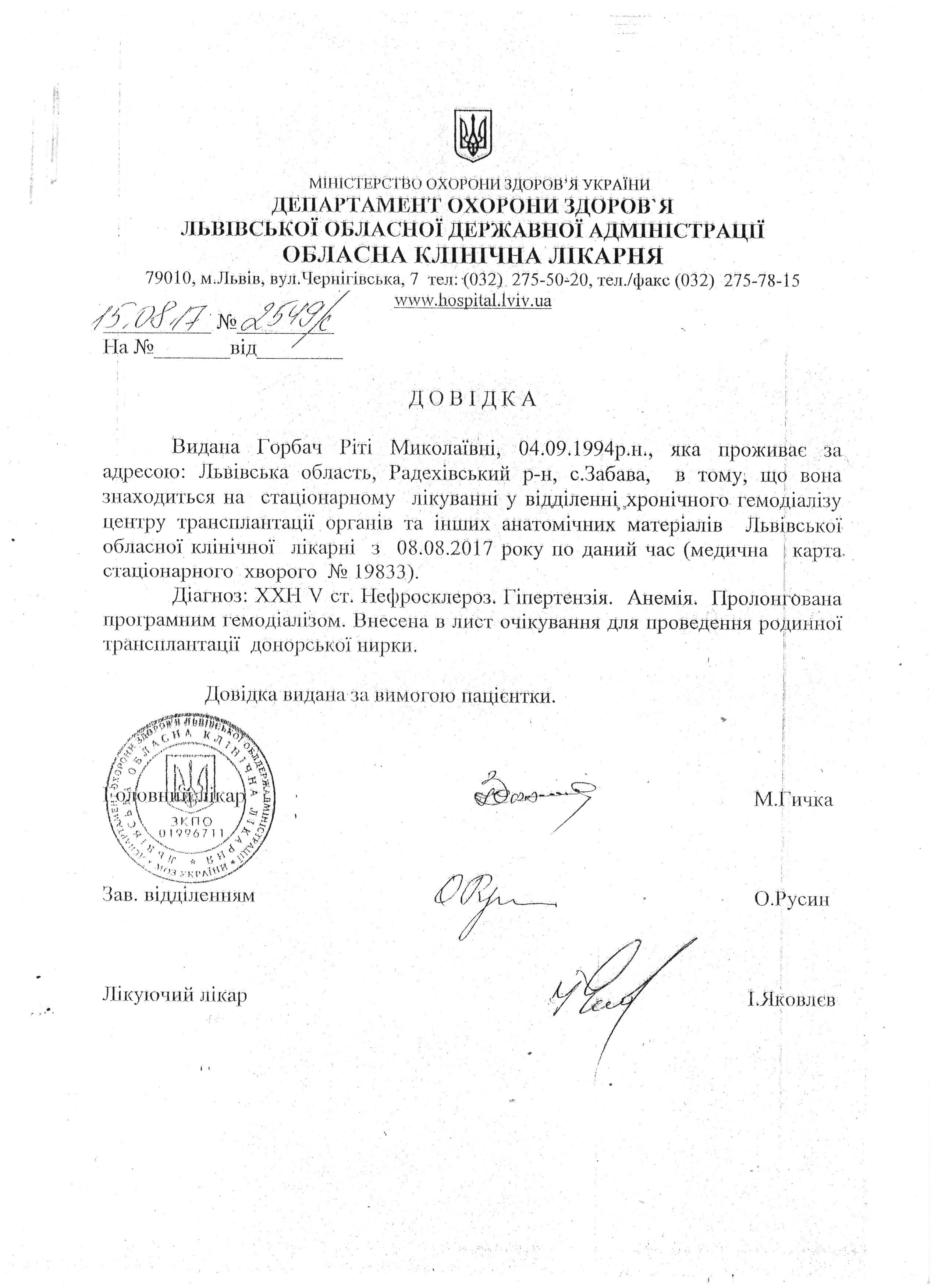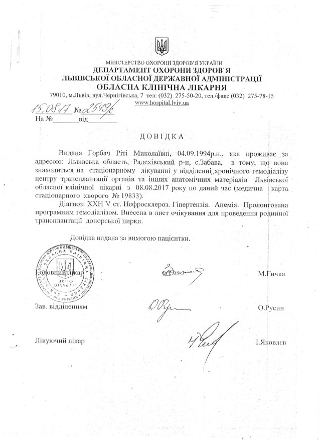 «ХХН V ст. Нефросклероз. Гіпертензія. Анемія. Прологзована програмним гемодіалізом. Внесена в лист очікування для проведення родинної трансплантації донорської нирки, - йдеться у довідці, виданій Львівською обласною клінічною лікарнею.