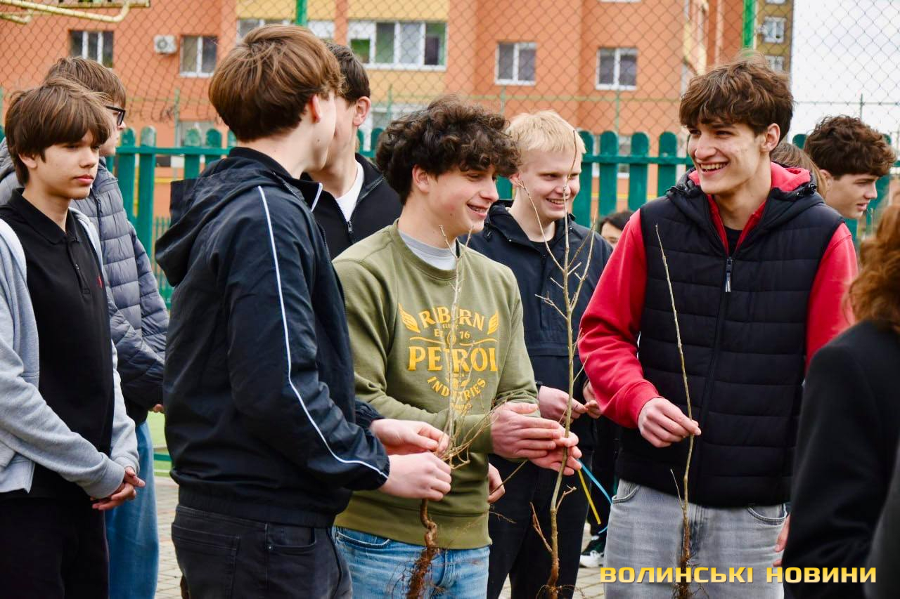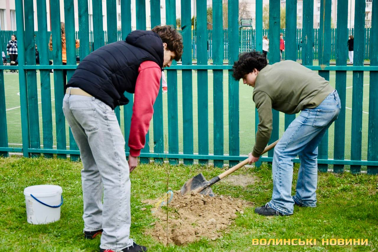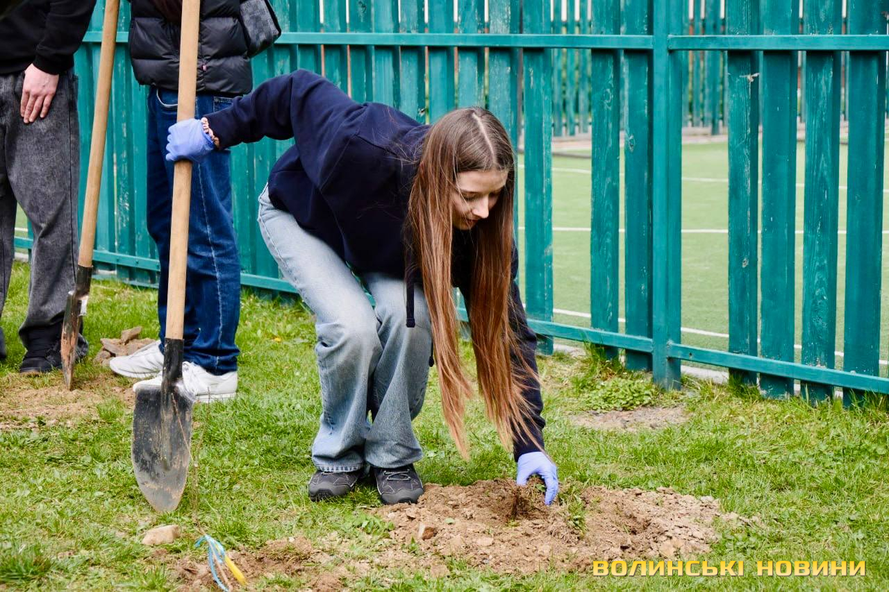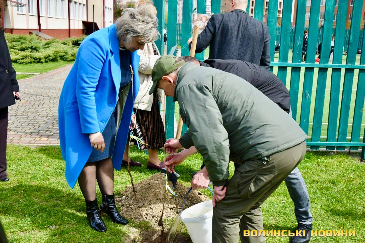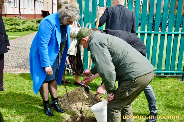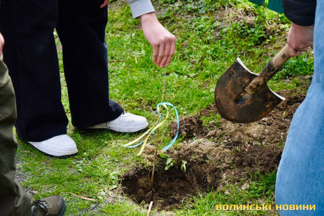 До заходу долучилися представники міської ради, Державної екологічної інспекції у Волинській області та здобувачі освіти ліцею.Дуб має велике символічне значення для українців, адже такий же міцний та непохитний, переконаний директор департаменту освіти Луцької міської ради Віталій Бондар.«Маємо гарну нагоду, приурочену до щорічної толоки – екоакцію «Дуби Шевченка єднають Україну». Дуб – це дерево, яке має глибоке коріння і досить потужне гілля, а стовбур дуже міцний: це символічне дерево для нас, українців. І в межах нашої толоки маємо можливість їх висадити в одному з найкращих закладів області, адже його здобувачі освіти щороку показують чудові результати на різноманітних олімпіадах, турнірах, тестах. Тому сьогодні спільно з відділом екології Луцької міської ради, Державною екологічною інспекцією у Волинській області за підтримки секретаря та виконувачки обовʼязків Луцького міського голови Катерини Шкльоди проводимо цю акцію», – наголосив Віталій Бондар.Як вже згадували, у Луцьку екоакцію «Дуби Шевченка єднають Україну» проводять вже вчетверте, раніше такі дерева висадили у сквері героїв Майдану та Небесної сотні, у ЗОШ №7 та ЗОШ №3, розповіла начальниця відділу екології Луцької міської ради Оксана Лисак.«В Україні є багато старовікових дерев, які спеціально доглядають та оберігають, бо вони є безцінним рослинним генофондом. І от, власне, всі ми знаємо нашого геніального поета, провидця Тараса Шевченка, він, будучи маленьким, коли працював на пана Енгельгардта, писав свої перші твори, проживав на Черкащині, і саме там є три дуби, яким близько тисячі років. У 2018 році активна молодь розпочала розмножувати ці дерева з жолудів і робити з них цілі парки та сквери, цю акцію взяло під егіду Міністерство довкілля, й відтоді вона стала щорічною. Зараз вона відбувається у такому масштабі – через територіальні підрозділи Державної екологічної інспекції по всіх областях України розсилають по 25 саджанців дубів, акція стала проявом єдності, адже це кількість наших територіальних одиниць в країні. Також захід є частиною ініціативи Президента «Зелена країна», яка спрямована на підтримку збереження природи в Україні», – розповіла передісторію виникнення екоакції Оксана Лисак.Перед висаджуванням до кожного дерева символічно підвʼязали жовто-блакитну стрічку, опісля спеціаліст із лісу Юрій Іванович детально розповів учасникам акції, як потрібно висаджувати дерева. І лише після цього дорослі та школярі під суворим керівництвом експертів взялися до роботи.До екоакції в межах толоки радо долучилися 11-класники Антон Жур та Ілля Паридубець. Хлопці кажуть: мріють, аби Луцьк став одним з найбільш екологічних міст в Україні, саме тому хочуть повʼязати майбутнє зі сферою екології.«Зараз, коли наша держава перебуває у стані війни, екологія зазнає великих руйнувань і потребує постійного відновлення. Якщо це нині не відчутно нам, то хочеться, аби у майбутньому наші нащадки були здоровими і дихали чистим повітрям», – поділилися школярі.Їхня однокласниця Ірина Кузьмяк такої ж думки і прагне, аби до таких ініціатив долучалося все більше свідомих людей.«Я дуже рада, що долучилася до екотолоки і допомогла висаджувати дерева на території свого ліцею. Зараз весна, така пора, коли все розквітає, і хочеться зробити свій внесок в озеленення м