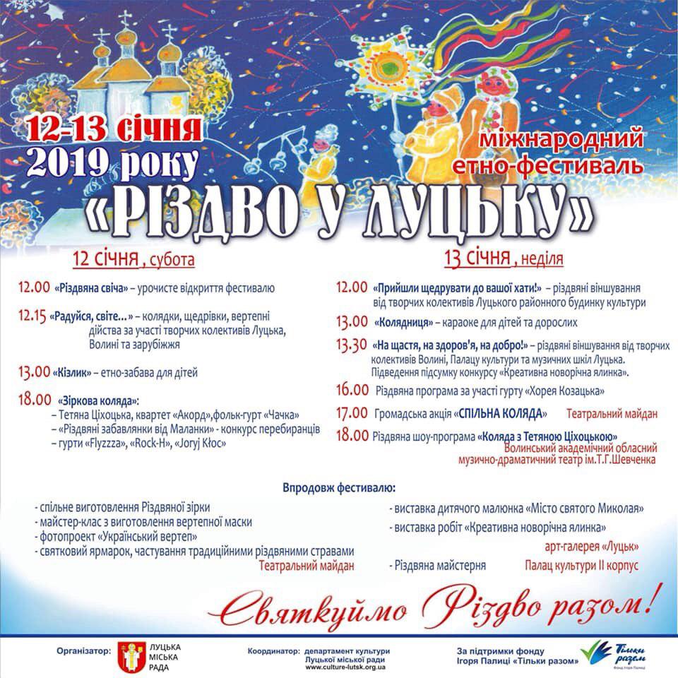 12-13 січня 2019 року на Театральному майдані міста Луцька за підтримки Фонду Ігоря Палиці «Тільки разом» відбудеться етно-фестиваль «Різдво у Луцьку». Відповідне розпорядження підписав секретар міської ради, виконувач повноважень міського голови Григорій Пустовіт.