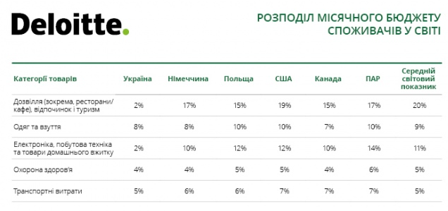 - електроніка, побутова техніка та товари домашнього вжитку: українці витрачають 2% бюджету на цю категорію, жителі Німеччини – 10%, Польщі – 12%, США – 12%, Канади – 10%, ПАР – 14%.У таких категоріях, як одяг та взуття, охорона здоров’я, транспортні витрати та цифрові послуги, немає відчутної різниці між українцями та жителями порівнюваних країн, додають в компанії.