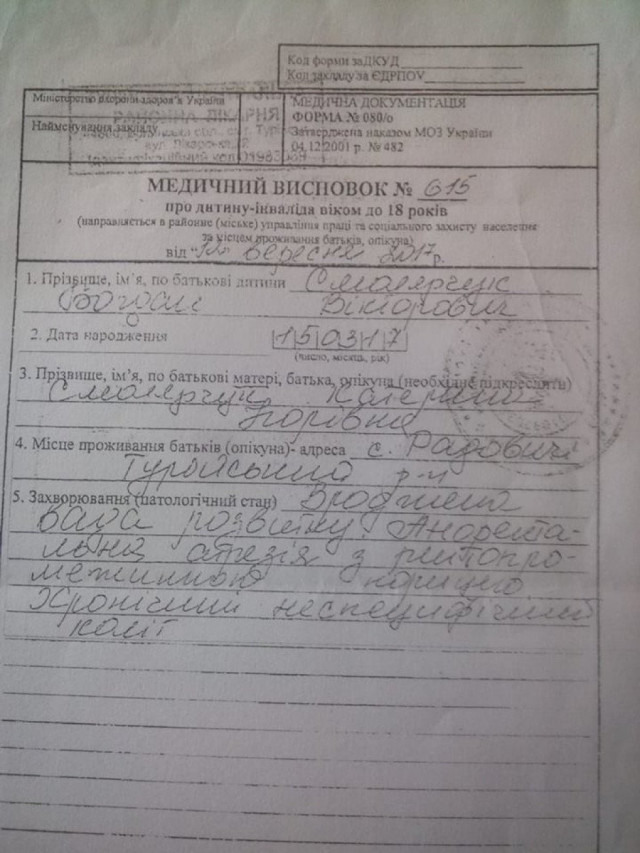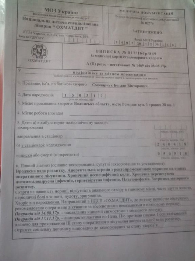 Біда спіткала малюка від самого народження. Лікарі поставили невтішний діагноз: вроджена вада розвитку. Аноректальна атрезія з ректопромежинною норицею. Хронічний неспецифічний коліт.