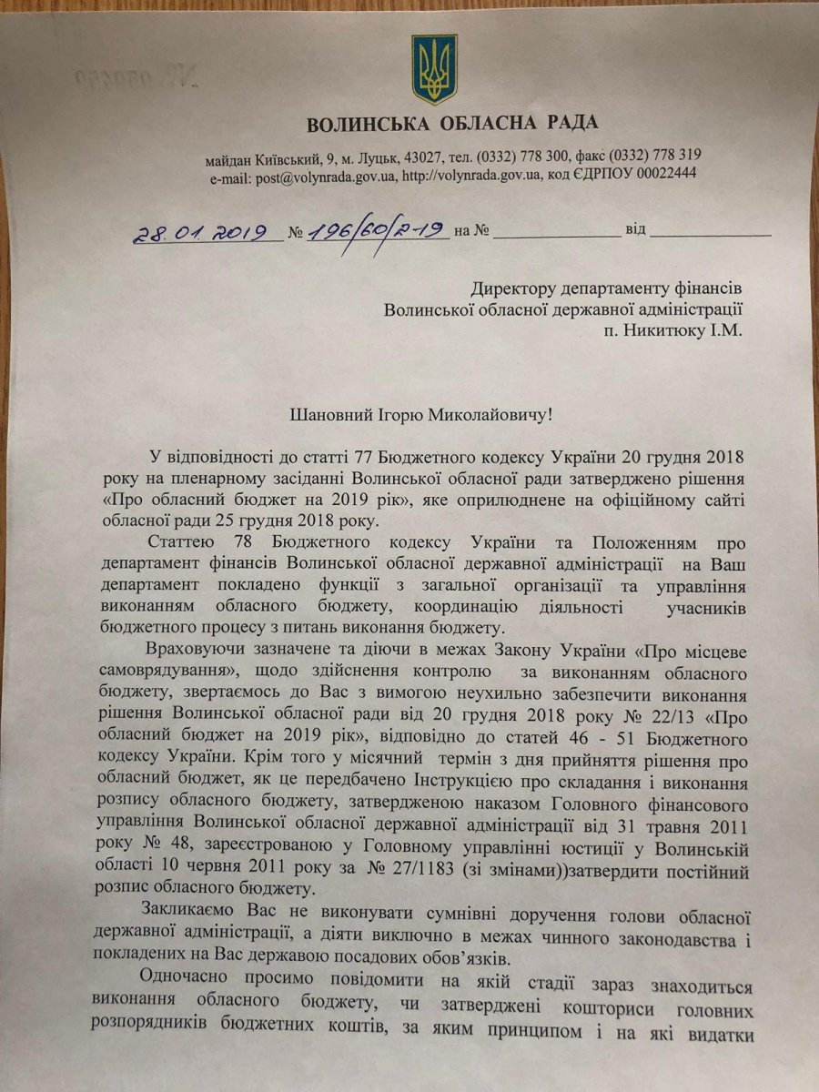 Згідно із п.1.6 Інструкції про складання і виконання розпису обласного бюджету, передбачено, що департамент фінансів Волинської ОДА в місячний термін після прийняття бюджетного рішення повинен підготувати та затвердити розпис. Водночас, голова ОДА Олександр Савченко видав доручення департаменту забезпечити здійснення витрат з обласного бюджету за тимчасовим розписом обласного бюджету, тобто не виконувати рішення про обласний бюджет.