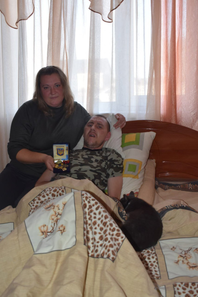 Він лежить на ліжку і намагається усміхнутися. Бо ж знає, що це прийшли журналісти, аби розповісти усім про його хоробрість, стійкість і боротьбу за життя. Він уважно слухає, як його дружина, його опора розповідає в деталях увесь воєнний шлях коханого. І час до часу його погляд робиться дуже сумним. А поряд на ліжку, згорнувшись клубочком, лежить котик.
