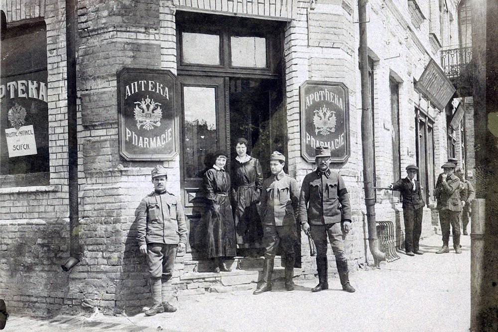 …А все почалося з аптеки. Ще в часи імперії Романових на центральній вулиці міста – Шосейній, яку перед Першою світовою перейменували на Імператора Миколи ІІ, – було кілька аптек. Одна з них потрапила на кілька поштових листівок і фотографій вулиці, оскільки містилася у вигідному місці. Неподалік – готель «Європейський», від якого вулиця спускається до Глушця (тепер це спуск вулицею Сенаторки Левчанівської на старий ринок), а біля нього міський сад з каплицею.