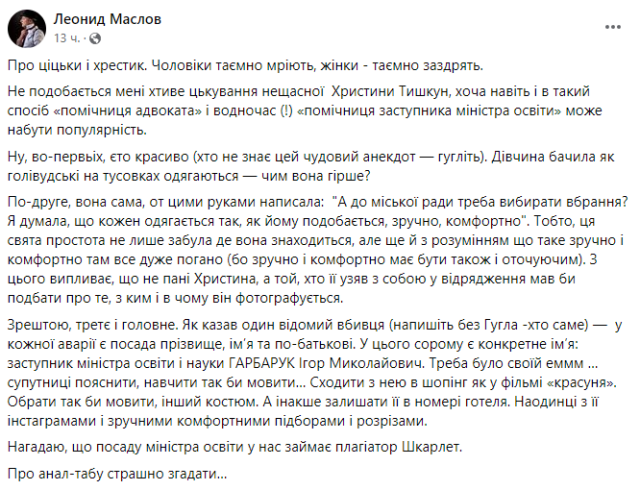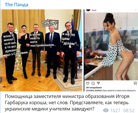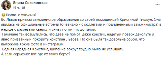 До Львова приїхав заступник міністра освіти зі своєю помічницею Крістіною Тишкун. Вона з’явилася на офіційні зустрічі (очевидно – з колегами та підлеглими заступника міністра) у наряді з розрізами зверху та знизу майже до талії.