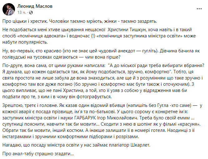 «Треба було своїй хммм... супутниці пояснити, навчити так би мовити... Сходити з нею на шопінг як у фільмі «Красуня». Вибрати інший костюм. А інакше залишити її в номері готелю. Наодинці з її інстаграмами, зручними-комфортними каблуками і розрізами».«Галичани взагалі повинні бути в захваті – головне, що у пані Тишкун хрестик на виду! Благовірна християнка, які питання? Хіба можуть бути більш цнотливі панночки, ніж галичанки, та ще з таким хрестом, який, мабуть, святив їй сам Папа?