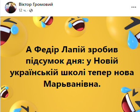 «У новій українській школі з'явилася нова Маріванна», - пише журналіст Віктор Громовий.Також у мережі вже публікують меми щодо цього інцидента.