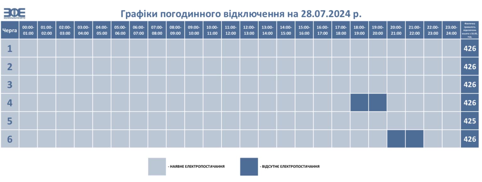 У неділю, 28 липня, у Волинській області діятимуть графіки погодинного вимкнення електроенергії.
