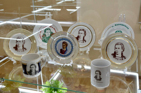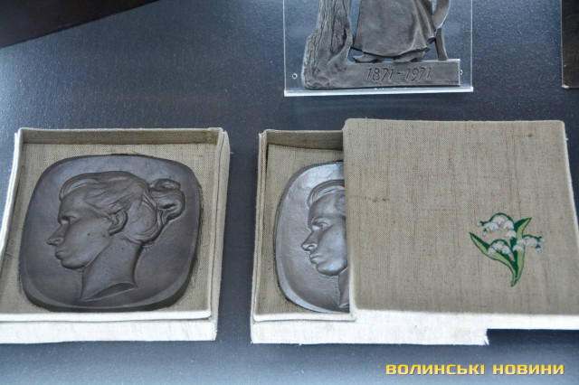Тут можна побачити ще скляні та порцелянові вироби з зображенням письменниці та локацій, пов’язаних із нею.Читати ще: «80% текстів або ніколи не друкувалися, або один раз». У волинському університеті представили 12 томів творів Олени Пчілки