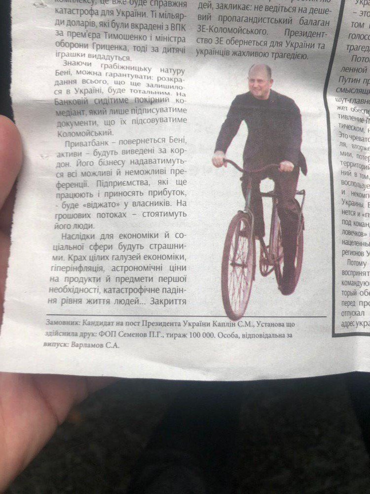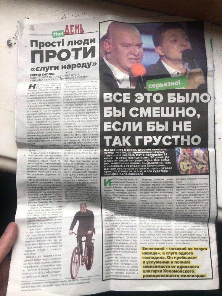 Разом з тим у вихідних даних самої газети зазначається, що її замовником є кандидат у президенти Сергій Каплін.