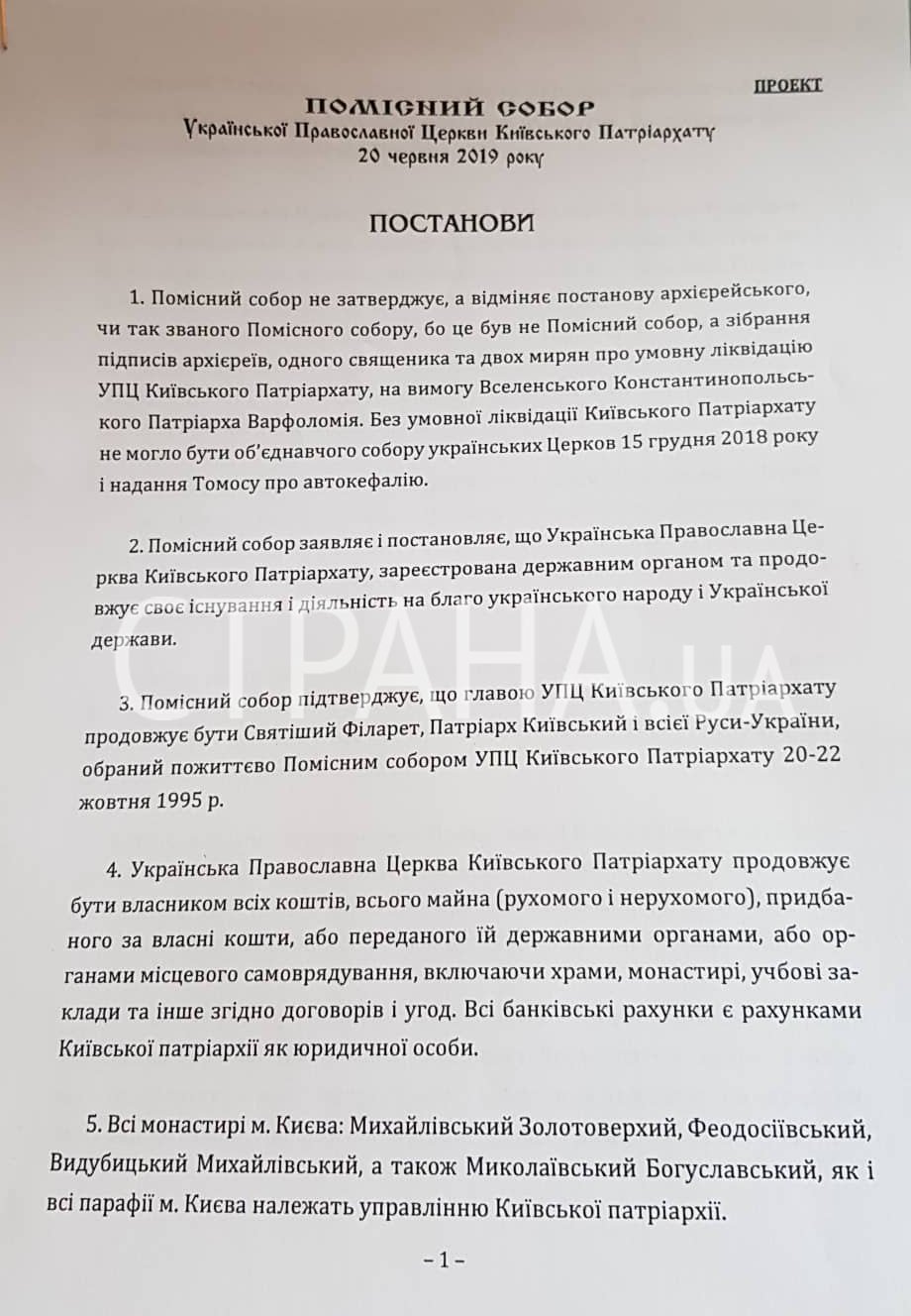 Зокрема, в постанові на двох аркушах А4 вказані основні 10 пунктів, на підставі яких церква Київського патріархату скасовує Помісний собор 15 грудня, на якому була створена ПЦУ.
