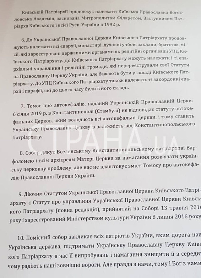 Зокрема, вже в першому пункті зазначається, що сьогоднішній Помісний собор скасував постанову архієрейського або так званого "Помісного собору", називаючи його "зборами підписів архієреїв, одного священика і двох мирян" на вимогу Константинополя з метою умовної ліквідації УПЦ КП. Без цієї процедури ніяк не могло відбутися видача Томосу Україні, йдеться в документі.