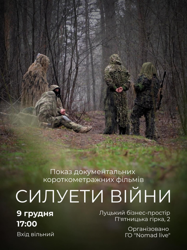 9 грудня у Луцькому бізнес-просторі (П’ятницька гірка, 2) о 17:00 відбудеться показ документальних короткометражних фільмів «Силуети війни».