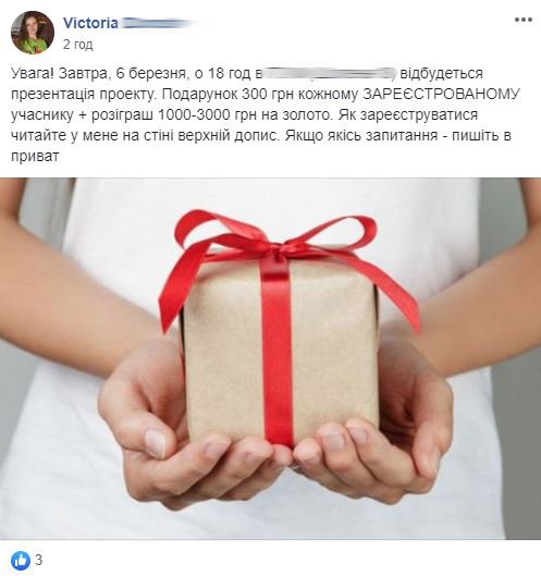 «Ви купили на 5 тисяч гривень, ми множимо на 8%, 400 гривень ви отримуєте щотижня. Одну п’ятницю ми пропускаємо і множимо на 52 тижні, виходить 20 тисяч 800, ви від 5 тисяч заробляєте за рік», – переконують продавці. І це ще не все, приводьте друзів і отримаєте додаткові бонуси.