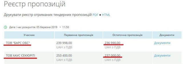 «У складі ТОВ «Барс Обс», і в ТОВ «Хаус Секюріті» до пропозиції додані довідки про нявність аналогічного досвіду, а також відповідні копії таких договорів. Що ж стосується документального підтвердження наявності транспортного засобу груп реагування, то обидва учасники не допрацювали з документами в цій частині. У першого учасника не знайдено таких документів, а в другого учасника – лише фото транспорту», – розповідає юристка Громадської ініціативи «За чесний тендер» Мирослава Примак.