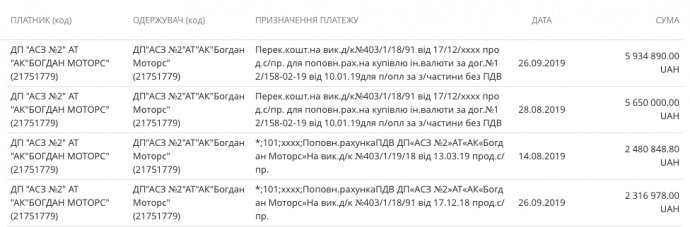 Гроші перераховані з рахунку Державної казначейської служби на приватний рахунок «Богдан Моторс», відкритий в «ОТП банку». За що саме сплачено гроші – кількість авто та вартість за одиницю – не вказано.