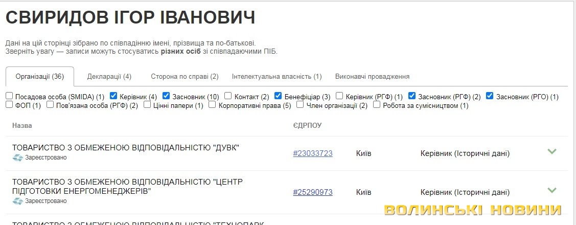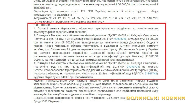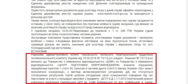 Позов до суду на «ДУВК» подало Черкаське обласне територіальне відділення Антимонопольного комітету України. Колегія АМКУ встановила, ТзОВ «ДУВК» та ТзОВ «ЦЕНТР ПІДГОТОВКИ ЕНЕРГОМЕНЕДЖЕРІВ» узгодили свою конкурентну поведінку під час підготовки та участі у процедурі закупівлі. Зокрема, йшлося про тендер на капітальний ремонт клінічного відділення Смілянської ЦРЛ ім. Софії Бобринської у місті Сміла, Черкаської області.Простими словами, підприємства змовилися і порушили Закон України «Про захист економічної конкуренції». Адже засновником ТзОВ «ЦЕНТР ПІДГОТОВКИ ЕНЕРГОМЕНЕДЖЕРІВ» є той же Ігор Свиридов.Нагадаємо, ДП «Служба місцевих автомобільних доріг у Волинській області» створили у лютому 2020 року. У його компетенції: ремонт та утримання доріг області, а ще – організація будівництва та ремонтів практично всіх об’єктів, яка відбувається за бюджетні кошти. Керівником без конкурсу призначили Ігоря Свиридова, колишнього депутата Донецької міськради від Партії Регіонів.