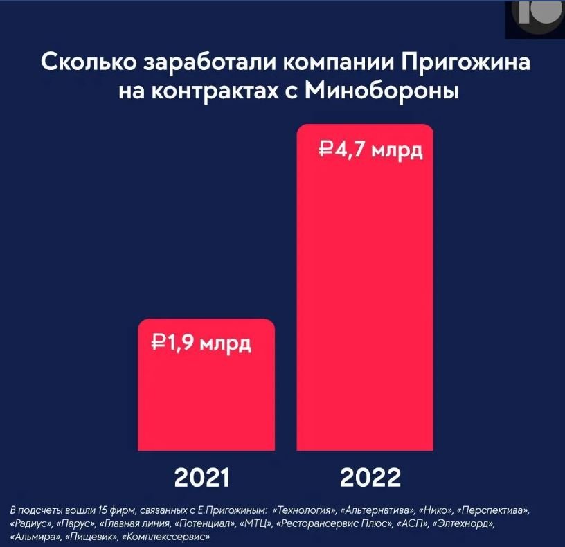 Більше грошей заробила і флагманська компанія на ринку харчування військових – ТОВ «Головна лінія». Це понад 618 млн рублів (проти 295 млн у 2021-му). До речі, «Головна лінія» уклала новий контракт із «дочкою» МО РФ, який діятиме до 1 квітня 2025 року.Рекорд поставила й компанія Пригожина «Мегалайн», відома за будівництвом військових містечок. За підсумками 2022 року її чистий прибуток склав 411 млн рублів (проти 257 млн у 2021-му). Ця юридична особа зараз укладає нові контракти з управлінням у справах президента Росії (на 19 млрд рублів).