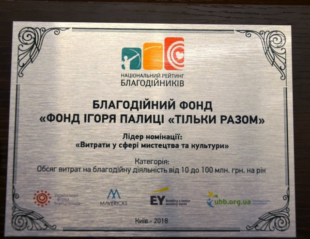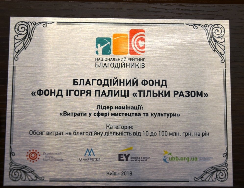 Фонд Ігоря Палиці «Тільки разом» втретє став номінантом у п'ятому Національному рейтингу благодійників серед українських фондів. Рейтинг об’єднав небайдужих людей, які допомагають тим, хто цього найбільше потребує. Цьогоріч Фонд лідирує у категорії «Обсяг витрат на благодійну діяльність від 10 млн грн до 100 млн грн на рік» в номінації «Витрати у сфері мистецтва та культури», повідомили у прес-службі Фонду.