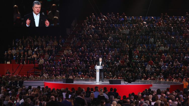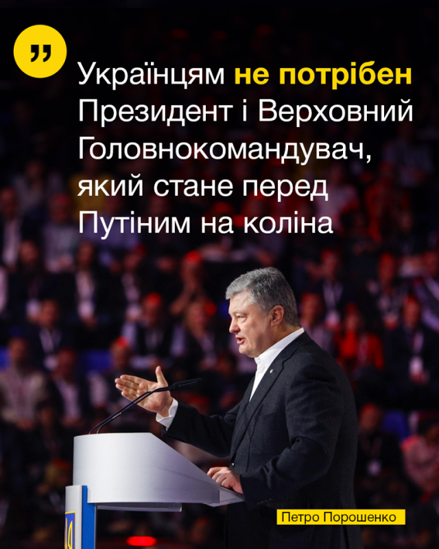 13:59 Петро Порошенко оголосив, що йде на другий термін. Всі люди в залі встали і аплодують йому стоячи. Він звів програму до двох-трьох стратегічних цілей – позбавлення людей від бідності, вступ країни в ЄС і НАТО, повернення миру на вигідних для України умовах і відновлення територіальної незалежності. Він говорить про те, що не дозволить, щоб «в офісі українського президента сидів зачеплений на гачок агент РФ» або той, "який стане перед господарем Кремля на коліна".13:44 Криза - позаду. «Надію вселяє те, що найгірше – точно позаду. Що криза, викликана війною, економічної агресією і блокадою з боку Росії, – відступає. Що відновлення економічного зростання відкриває можливості і до відновлення рівня життя», – заявив Порошенко. «Сьогодні ми вже можемо ставити собі ті завдання, які ще вчора здавалися б порожніми обіцянками. Свою стратегію подолання бідності озвучив 29 січня.... Отже, наступати будемо за п’ятьма напрямками: агропромисловий комплекс, ІТ-індустрія, машинобудування, інфраструктура і логістика, туризм» , – підкреслив він.