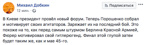 "У Києві президент провів новий форум. Тепер Порошенко зібрав і мотивує своїх агітаторів. Заряджає їх на останній бій. Це схоже на те, як перед самим штурмом Берліна Червоною Армією, Фюрер мотивував свій гітлерюгенд. Фінал цієї дурної затії буде таким же, як і травні 45-го «.15:00 Гості форуму вийшли на вулицю і прямують до своїх автобусів, на яких приїхали з регіонів.14:30 Форум завершився. Люди виходять із зали. Деякі несуть в руках картонні коробки з брошурами, агітлистівки і календарями.