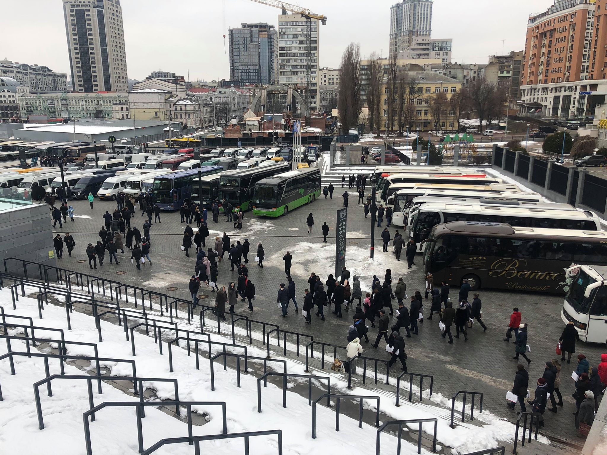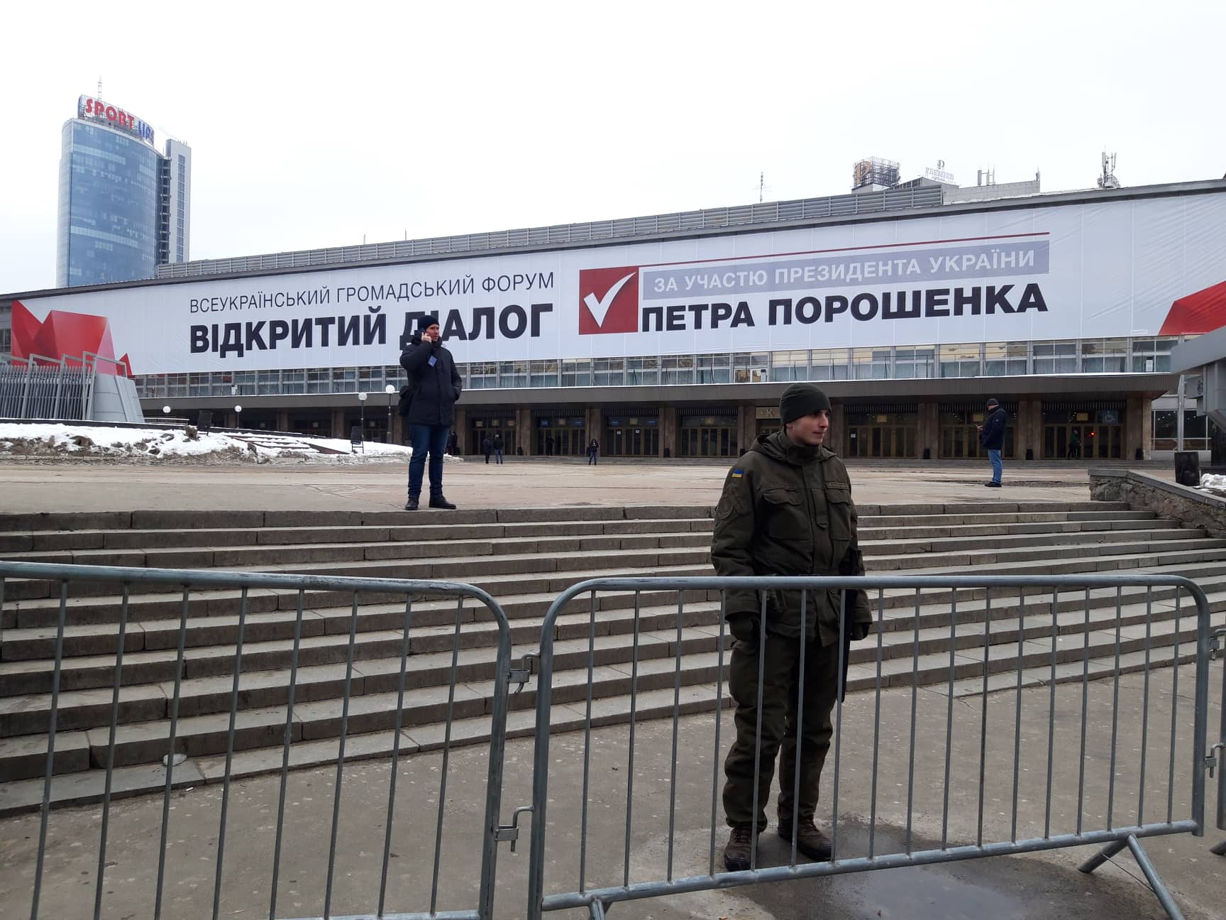 13:10 З’явилися панорамні фото біля Палацу Спорту. З високої точки видно кількість автобусів, які привезли людей на форум Петра Порошенка.13.00 На форум привезли обіди, воду і соки. Що входить в обід – не зізнаються. Але окремою машиною доставили кілька десятків коробок в чорних сміттєвих пакетах. Через пакети видно, що в ящиках – вино Коблево і горілка «Президентський стандарт». Горілку вантажать в автобуси, на яких приїхали учасники форуму.12:45 Поблизу Палацу Спорту тихо. Людей майже немає, а всі гості, мабуть, уже всередині. Багато з тих, хто приїхав з регіонів, групувались і чекали своїх кураторів зсередини. Вони виносили людям запрошення.