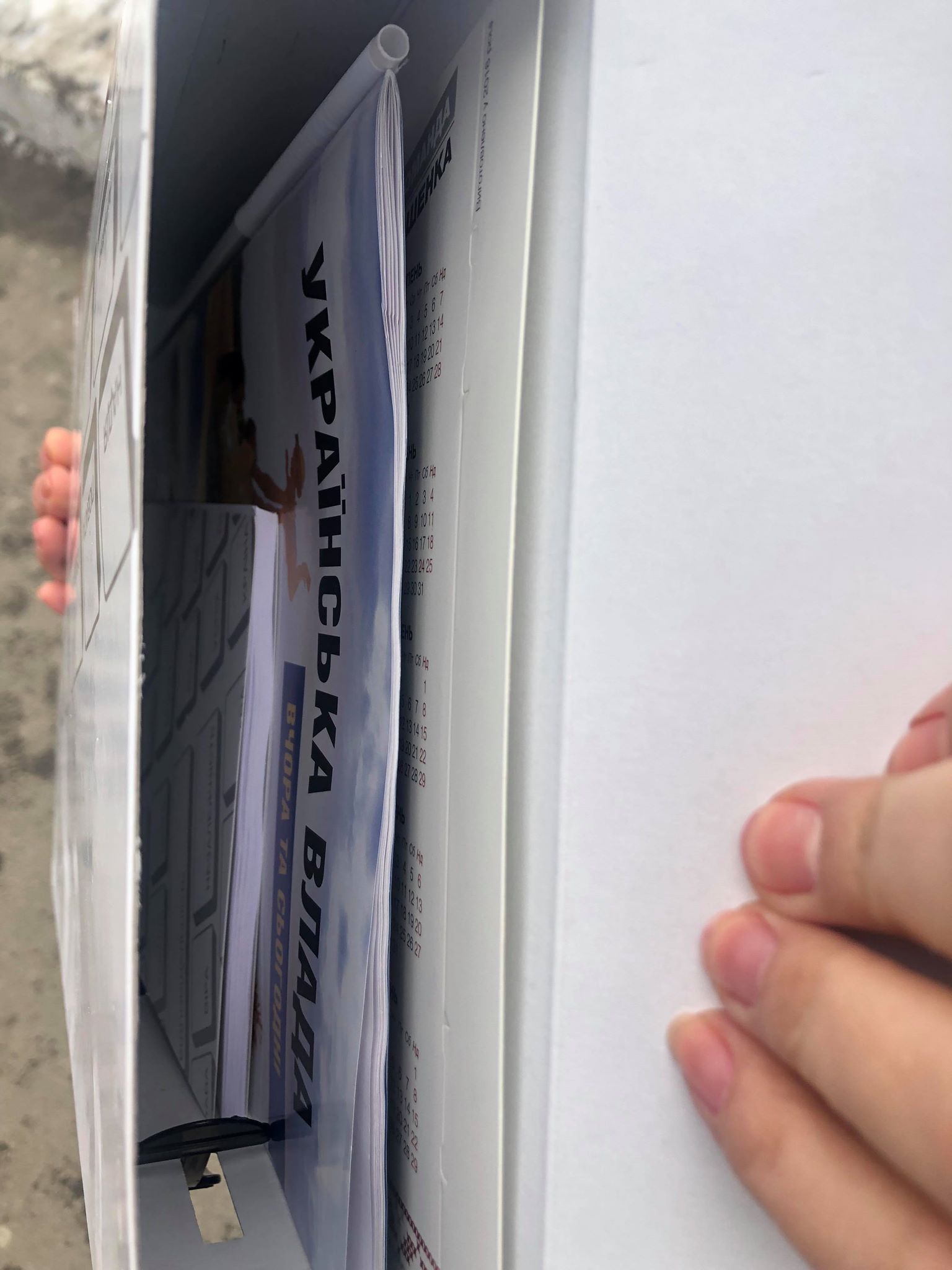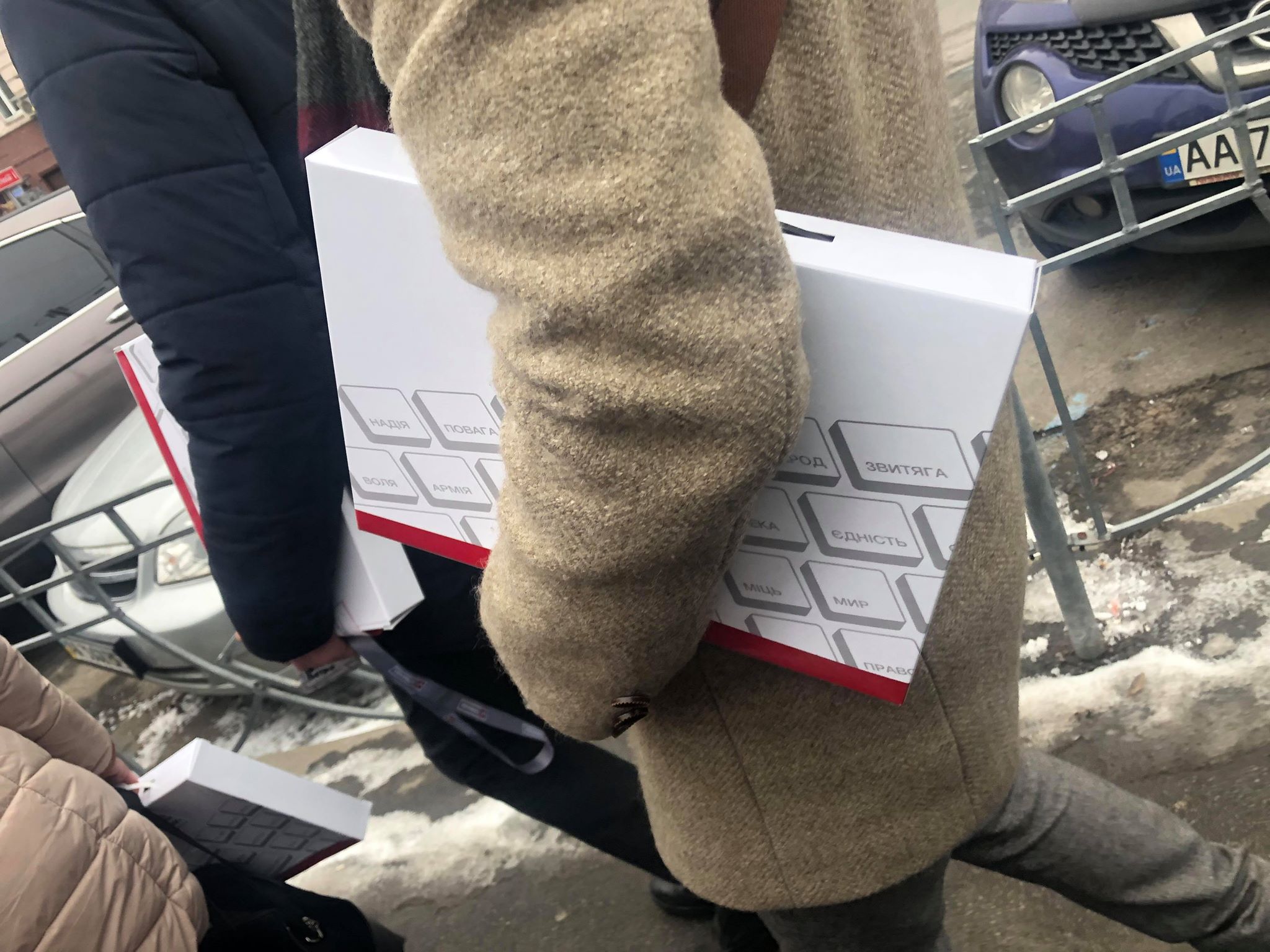 У цих же коробках портрети Порошенка в паперовій рамці, щоб ставити на стіл. Однак люди чомусь сором’язливо ховають вміст пакетів, в яких ще прапор на пластиковій ніжці.До речі, в коридорах Палацу Спорту були розставлені воскові фігури, які викликали певне здивування у гостей зустрічі.