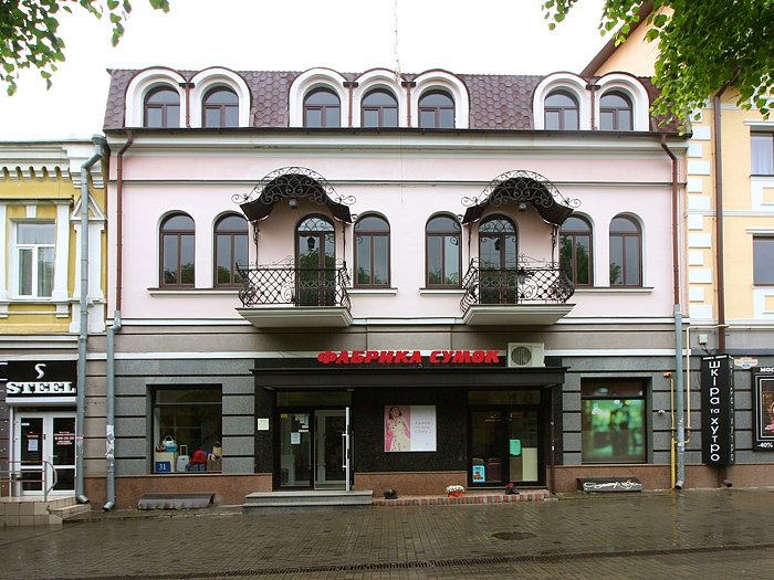 Вже на плані фрагменту вулиці Шосейної 1897 року неподалік П’ятницької гірки позначена ділянка міщанки Малі Окс. Чи був там якийсь будинок на той час, невідомо. Проте вже в 1906 році тут зводять двоповерховий будинок цегляного стилю. Вочевидь, будівництво пов’язане і зі зміною власника, позаяк згодом власником будинку вже фігурує Мойсей Окс. Його будови витягнулися вглиб кварталу так, що один фасад виходив на Шосейну (тобто Лесі Українки теперішню), а протилежний фасад – на П’ятницьку гірку (згодом у радянський час це була вулиця Горького). Група будівель сформувала затишний внутрішній двір.