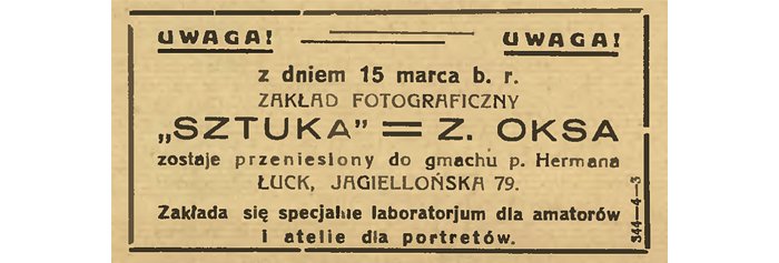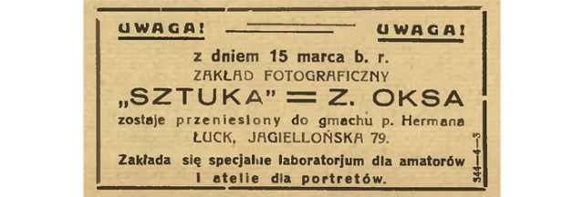 Фотопавільйон перестав функціонувати за цією адресою. І справді ательє Окса Sztuka переїхало в інший будинок на цій же вулиці – на Ягеллонську, 79. В наш час це Лесі Українки, 49.Тут воно працювало до 1939 року, після цього відомостей про ательє знайти не вдалося.За надані портрети ательє Sztuka висловлюю подяку Віктору Літевчуку.Олександр КОТИС