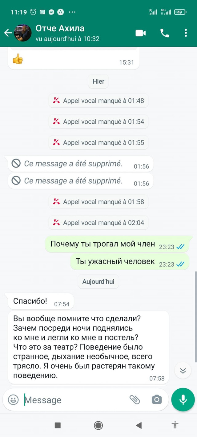 Француз також опублікував листування зі священником, яке спростовує звинувачення аспіранта. З нього виходить, що Ніколя сам раптово прийшов у ліжко до священника, чим його здивував і налякав. Ні про яке зґвалтування в листуванні і не було. І справді, справа схожа на сплановану провокацію з боку француза.Журналісти зв'язалися із самим архімандритом Ахілою Шахтаріним, який прокоментував ситуацію.