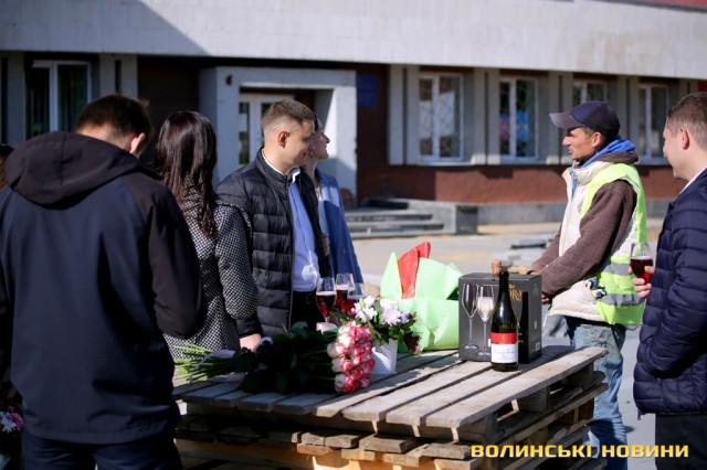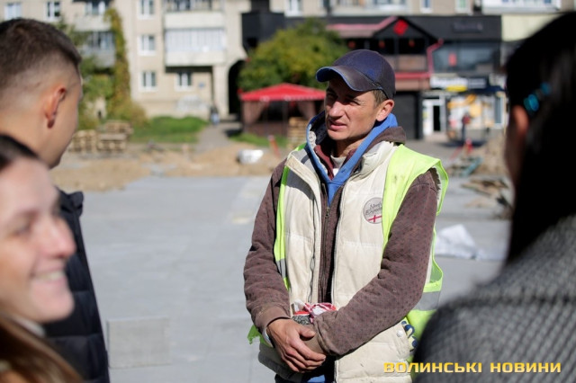 Роботи з реконструкції площі перед Палацом урочистих подій тривають. Інформаційне агентство Волинські Новини стало свідком, як робітники вітають молодят з одруженням, даруючи їм каміння.
