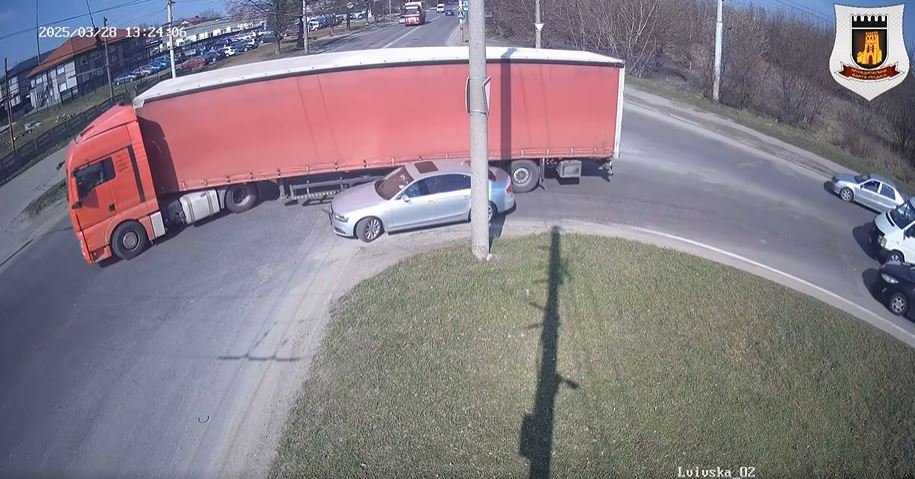 Водій «AUDI» не надав переваги в русі вантажівці, порушивши вимоги знаку 2.1 «Дати дорогу», який зобов’язує пропустити транспортні засоби на головній дорозі. Внаслідок зіткнення фура протягнула легковик, завдавши незначних пошкоджень.