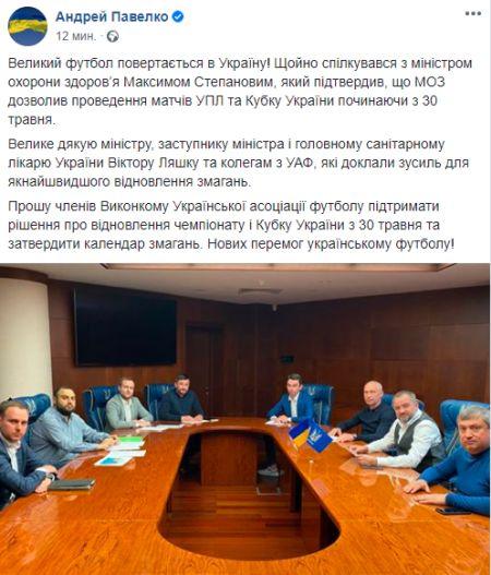 Про це на своїй сторінці в facebook повідомив президент Української асоціації футболу Андрій Павелко.
