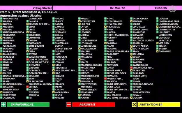 За проголосувала 141 із 193 країн-членів, 35 утрималися, п’ять проголосували проти (Росія, Білорусь, Сирія, КНДР та Еритрея). Володимир Зеленський зазначив, що це свідчить про те, що «глобальна антипутінська коаліція сформована та діє».
