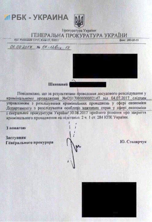 Згідно з документом за підписом заступника генпрокурора Юрія Столярчука, справу закрито на підставі п. 2 ч. 1 ст. 284 Кримінально-процесуального кодексу України (встановлена відсутність в діянні складу кримінального правопорушення).