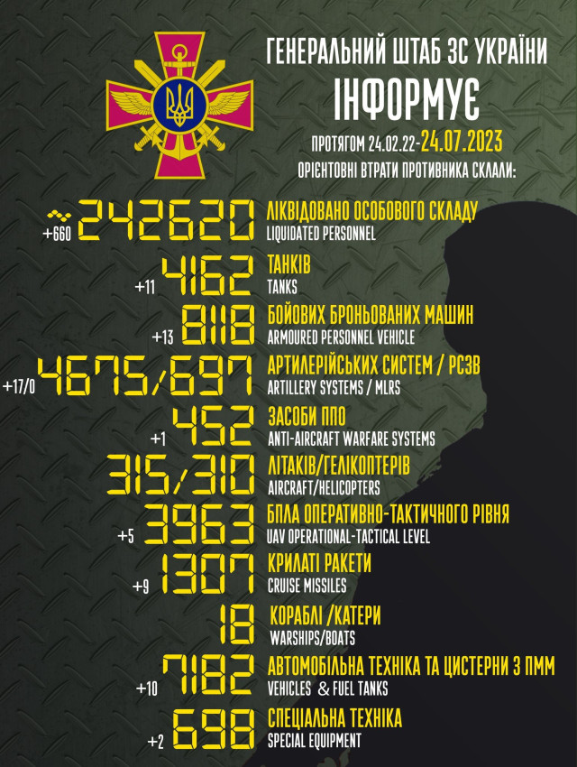 За минулу добу російська армія втратила приблизно 660 військових, 11 танків, 13 бойових броньованих машин, 17 артилерійських систем і засіб ППО. Загалом на війні в Україні вже загинули 242 620 росіян.