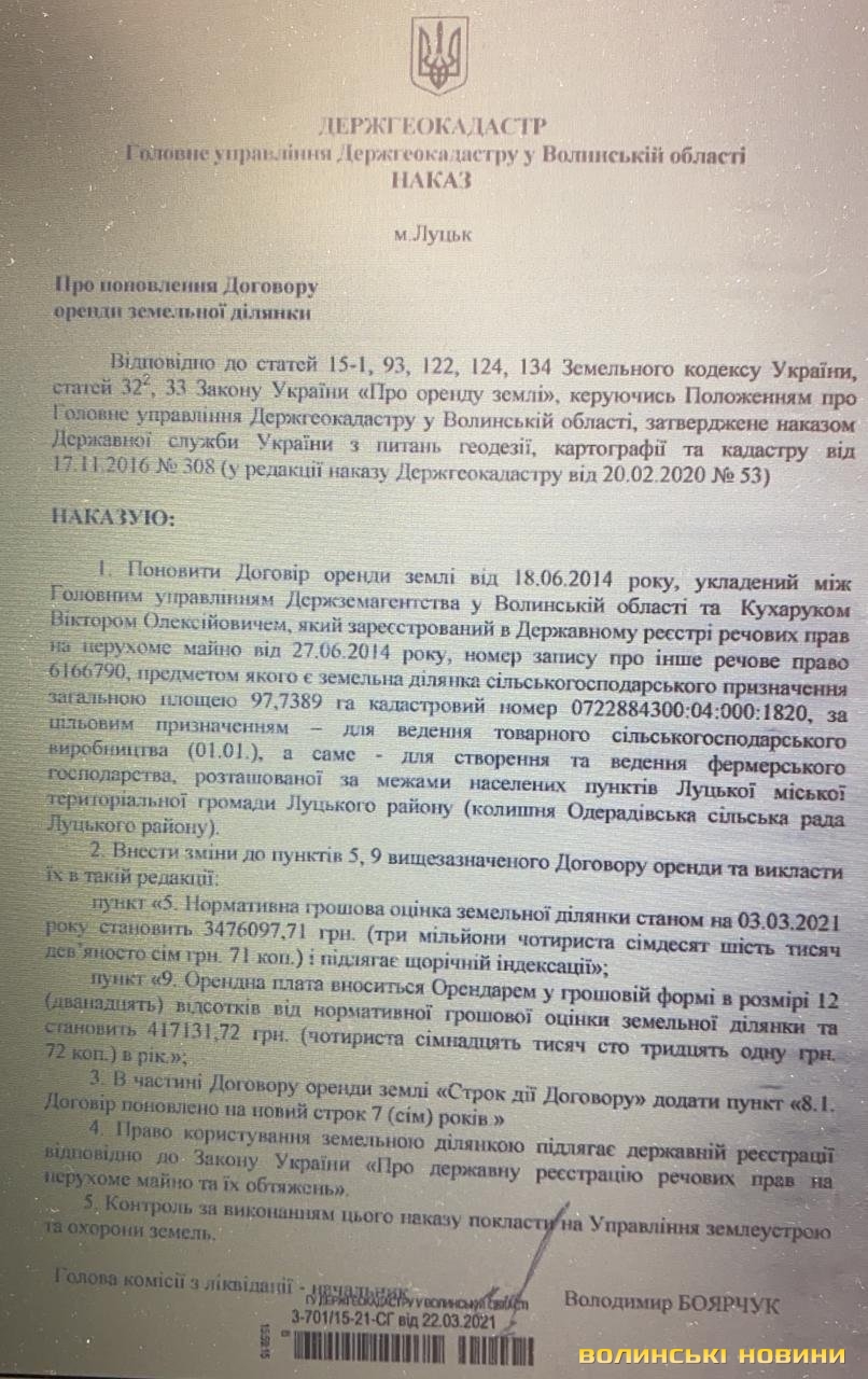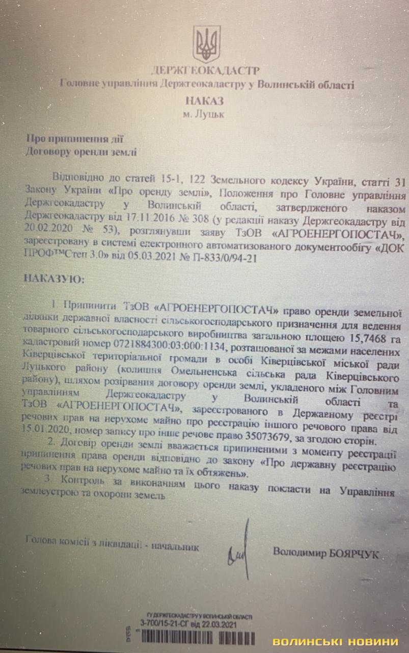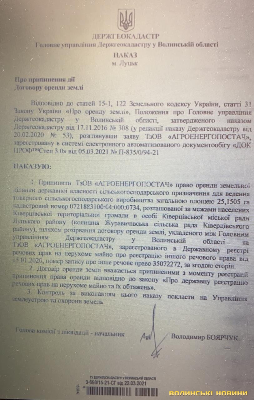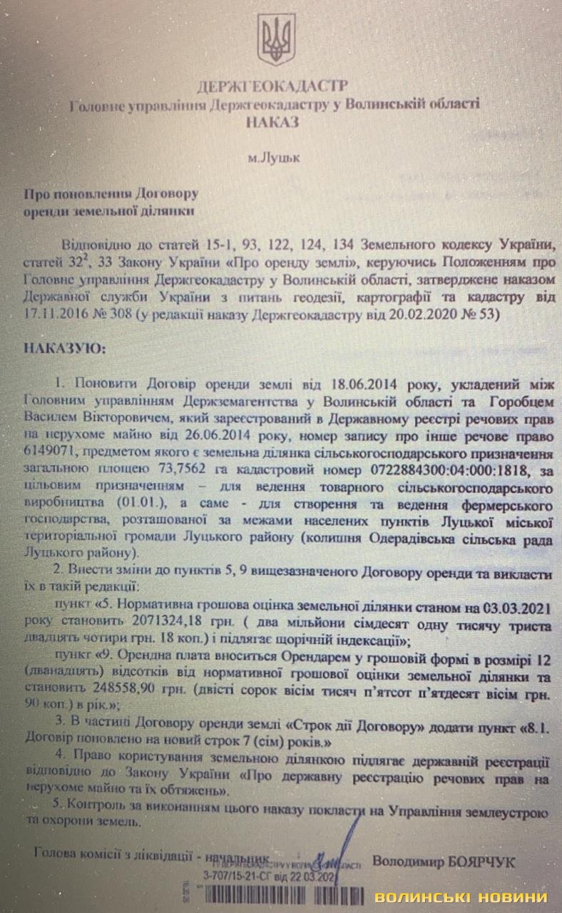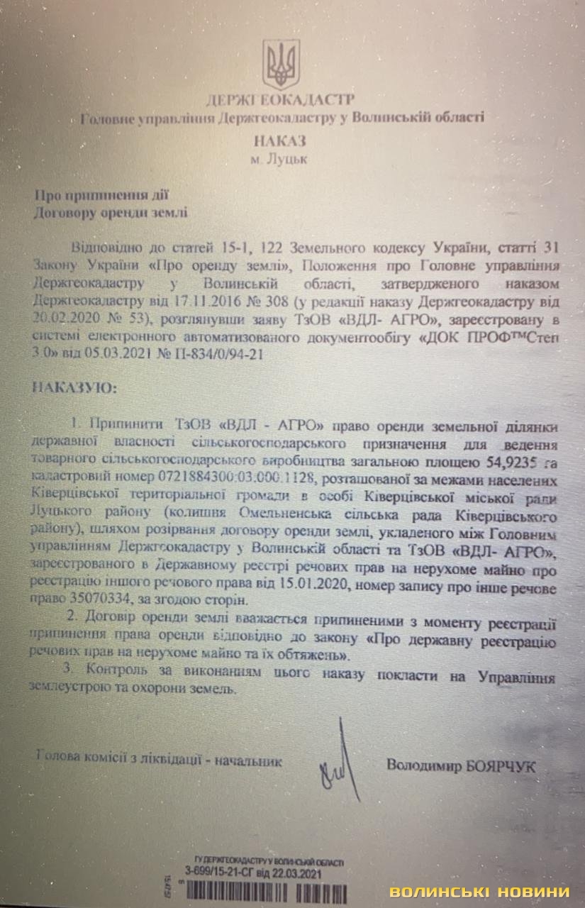 22 березня 2021 року Володимир Боярчук підписав три накази "Про припинення права оренди земельних ділянок":