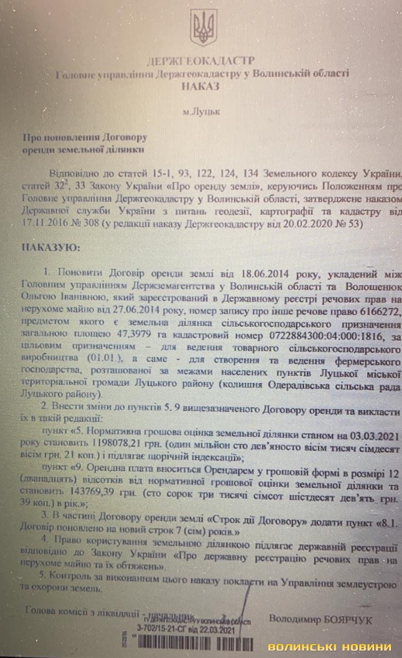 Проте цього ж дня начальник волинського Держгеокадастру підписує ще три накази аграріям з Луцького району, але вже з абсолютно протилежним змістом:
