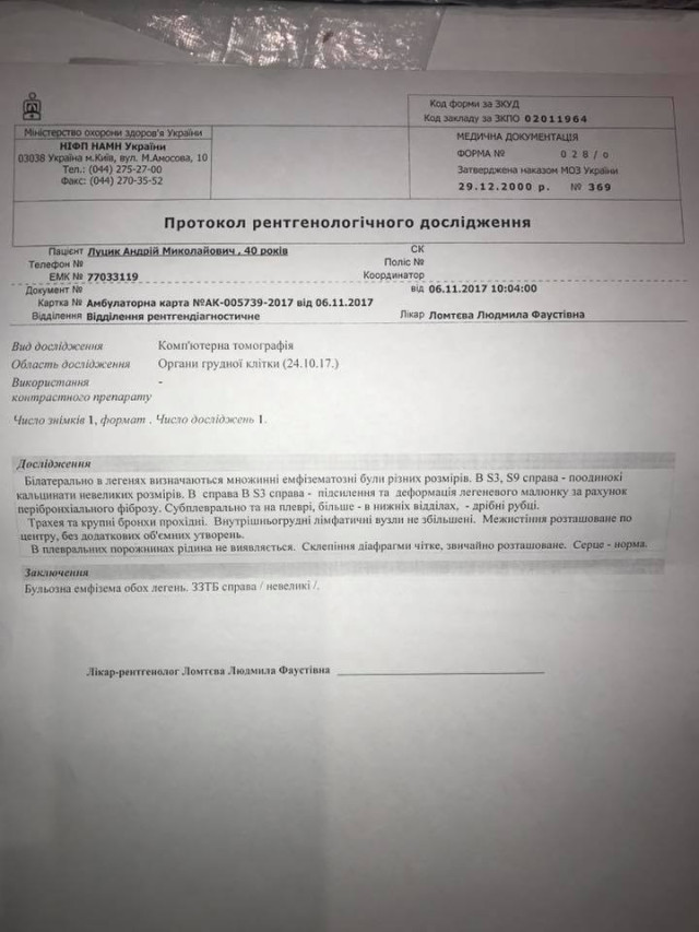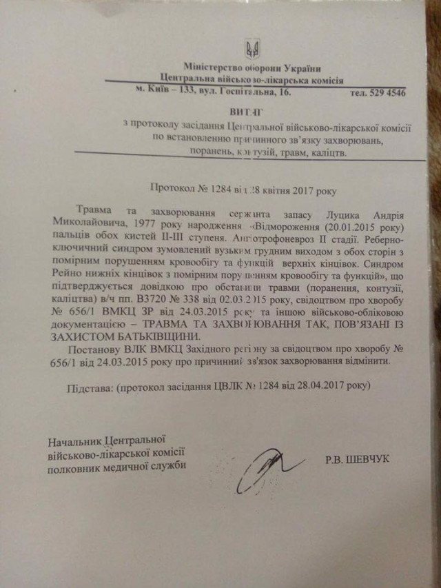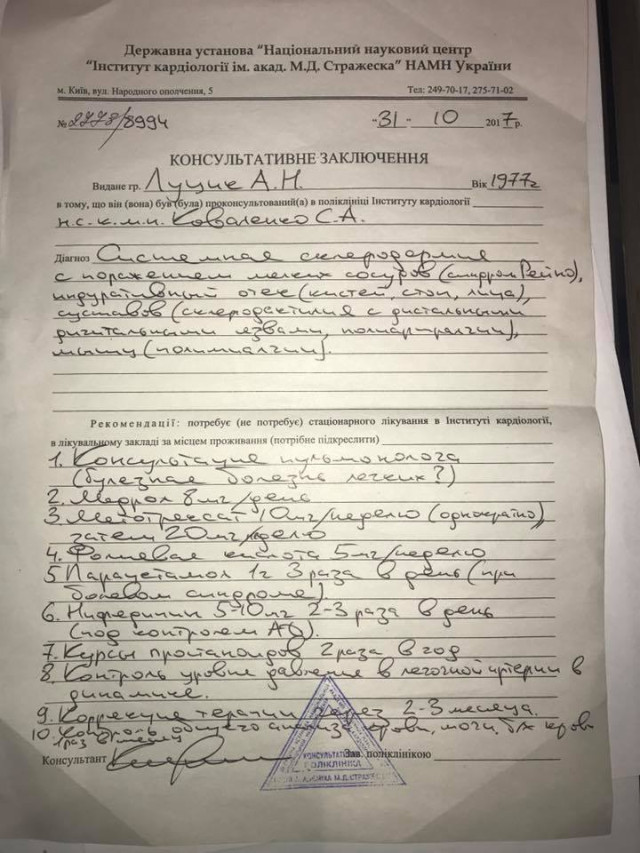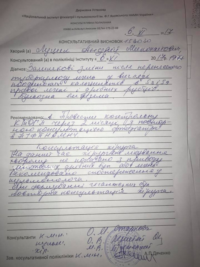 "Підкосило, що призначене лікарями нове лікування довготривале.. Полегшення можливе лише згодом… І ще .. АНДРІЙ ВРАЖЕНИЙ ЦІНАМИ НА ПРИЗНАЧЕНІ МЕДИКАМЕНТИ.. Луцик – інвалід війни II групи.. Отримує сьогодні пенсію від держави 3 476 грн. 05 коп.... Виховує двох синів, дружина Наталка Луцик працює у дитячому садочку.. Чим платити за ліки???!!! Державою забезпечення ліками такого пацієнта в повному обсязі за рецептом лікаря не передбачено...Андрію, щоб жити далі, лише наперші 2 міс. потрібно 42 000 грн... Це ліки, 10 процедур плазмоферозу та постійні аналізи і обстеження... Як вижити герою війни???!! Знову надія лише на людей... Надія лише на НАШИХ людей... Про це навіть писати боляче.....", - додає Попова.