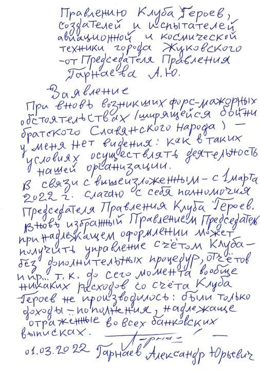 Герой Росії, льотчик-винищувач і голова Клубу Героїв Росії, виробників і випробувачів авіаційної та космічної техніки міста Жуковський Олександр Гарнаєв склав повноваження на знак протесту проти війни в Україні.
