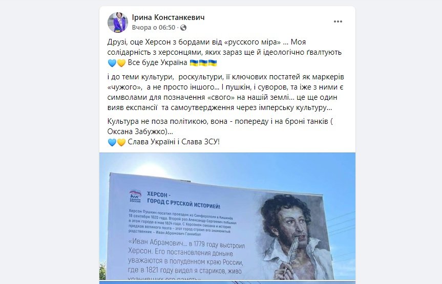 «І до теми культури, роскультури, її ключових постатей як маркерів «чужого», а не просто іншого... І пушкін, і суворов, та іже з ними є символами для позначення «свого» на нашій землі... це ще один вияв експансії та самоутвердження через імперську культуру... «Культура не поза політикою, вона – попереду і на броні танків», – Оксана Забужко», – пише нардепка.