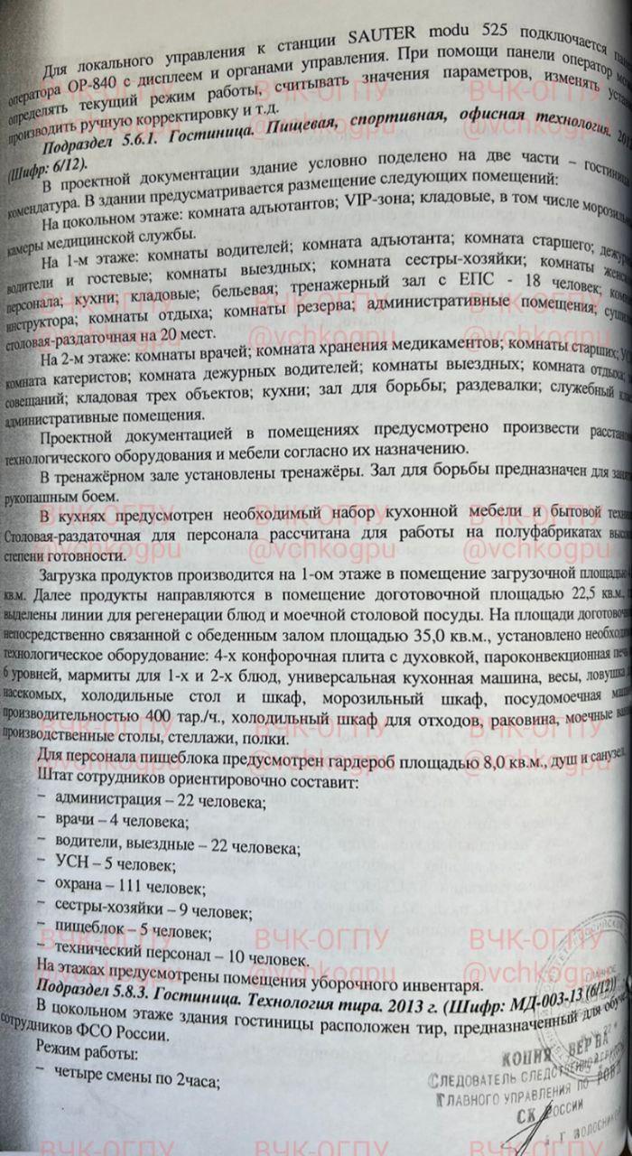 «Сама справа була засекречена через секретність «Об’єкта 53». Саме там живе Путін, проводить зустрічі (зроблено копію кабінету в Кремлі), там відбуваються наради Радбезу, може бути розташований бункер тощо... Із секретної документації можна дізнатися, що в приміщеннях, так би мовити, для персоналу, постійно чергують чотири лікарі, 111 охоронців. Охоронці чергують у чотири зміни по 2 години. Для охоронців із ФСО прямо на території, де живе Путін, обладнано тир зі стрілецькою галереєю, довжиною 50 м, приміщенням для чищення зброї», – зазначається в іншому повідомленні.Також вказується, що в кімнатах, де приймають їжу обслуга і охорона Путіна, постійно чергує охорона з чотирьох осіб, «мабуть, стежить, щоб їх усіх не отруїли».