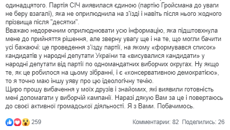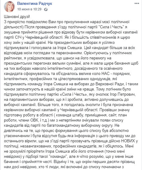 «З прикрістю повідомляю вам про призупинення наразі моєї політичної діяльності. Після проведення з’їзду політичної партії «Сила і Честь» я змушена прийняти рішення про відмову бути керівником виборчої кампанії партії в Чернівецькій області», – написала Валентина Радчук.