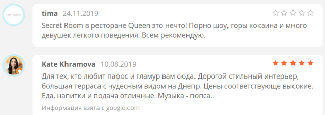 «Secret Room в ресторані Queen це щось! Порно-шоу, гори кокаїну і багато дівчат легкої поведінки. Всім рекомендую».Queen належить російському ресторанному холдингу Bulldozer Group. Власник – москвич Олександр Орлов. На офіційному сайті Bulldozer Group, зазначено, що холдинг управляє декількома десятками ресторанів по всьому світу, і серед них закладу в Росії, Україні, Казахстані, Китаї і ОАЕ.Також в цьому клубі влітку побував глава президентського офісу Андрій Богдан.