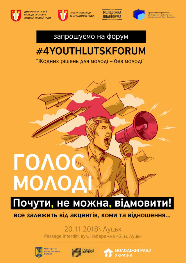 "Маєш, що сказати з цього приводу? Реєструйся на Форум #4YouthLutskForum: Голос молоді. Почути, не можливо, відмовити", що відбудеться у м. Луцьк 20 листопада 2018 року. Організатори – департамент сім'ї, молоді та спорту Луцької міської ради та ГО "Молодіжна платформа", - йдеться у повідомленні міської ради.