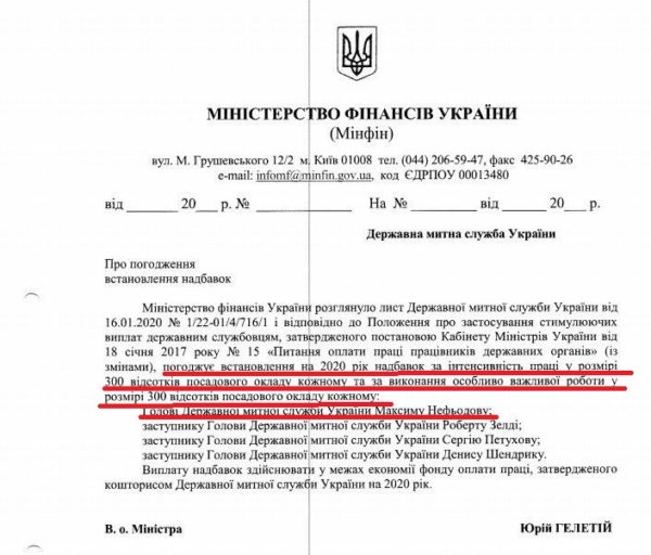 В одному з документів зазначено, що Нефьодову і його заступникам погодили надбавки в розмірі 300% від окладу за «інтенсивність праці», а також – за «виконання особливо складної роботи». У вересні та жовтні 2019 року Нефьодов отримував надбавки за ті ж заслуги в розмірі 200%.Сам голова митної служби не прокоментував цю публікацію.